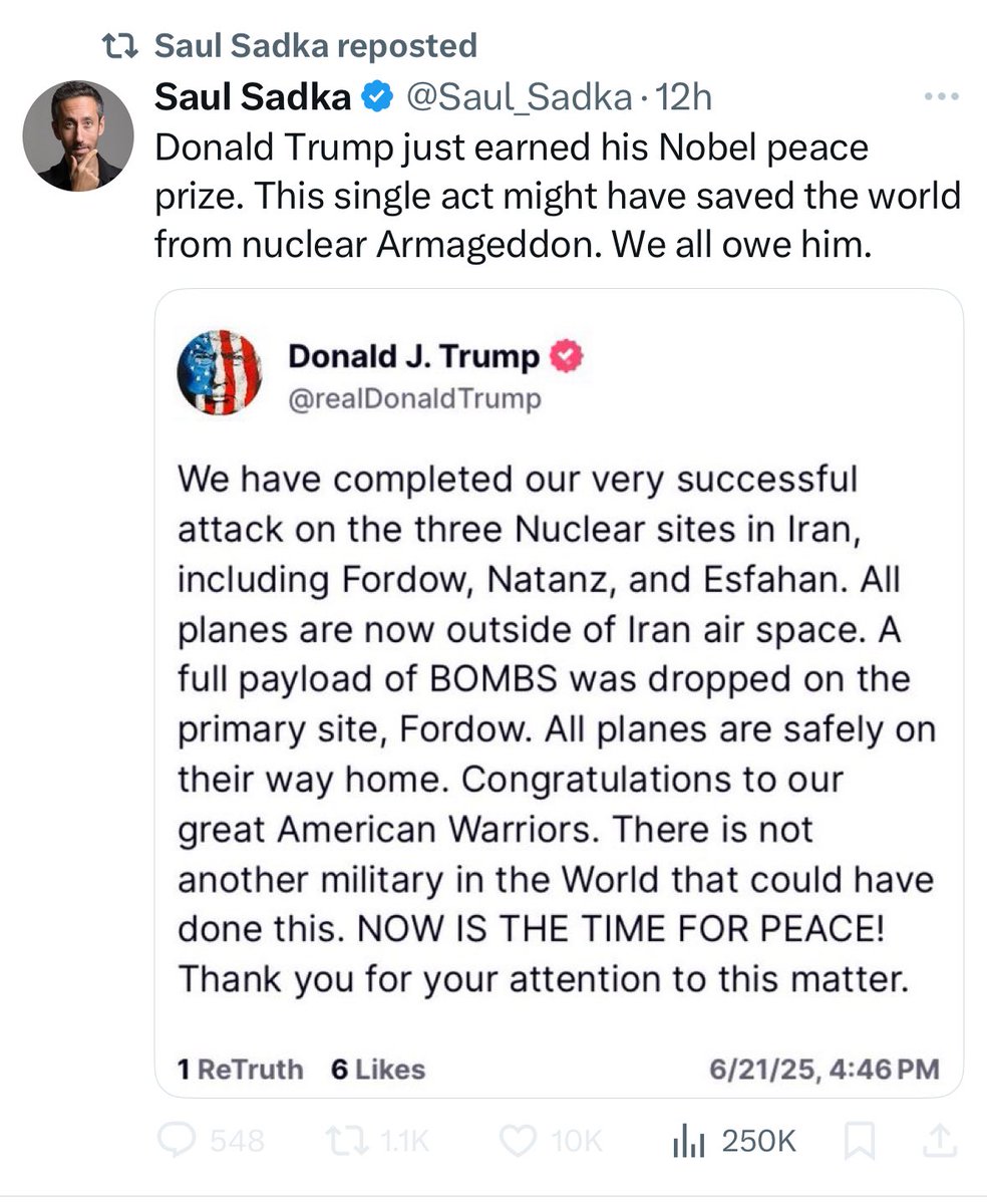 They're all getting instructions from Tel Aviv... https://x.com/SharonNadeem/status/1936766601375989912